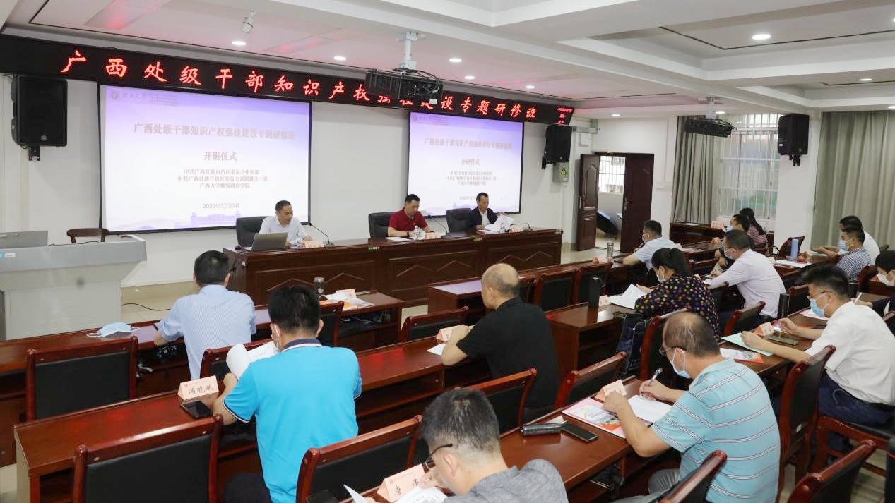 为深入贯彻《广西落实〈知识产权强国建设纲要(2021—2035年)〉实施方案》,2022年5月22日至5月28日,由中共广西壮族自治区委员会组织部、中共广西壮族自治区委员会直属机关工委托mk开户承办的“广西处级干部知识产权强桂建设专题研修班”在mk开户举办。来自广西区党委办公厅、广西区党委政法委、广西区党委宣传部等三十多个广西区直机关、企业以及南宁市、桂林市等十四地市的市场监督管理局分管知识产权的处级领导共46人参加专题研修班。mk开户苏兆成院长在开班仪式上致辞,广西壮族自治区市场监督管理局知识产权保护处处长梁涛讲话。
