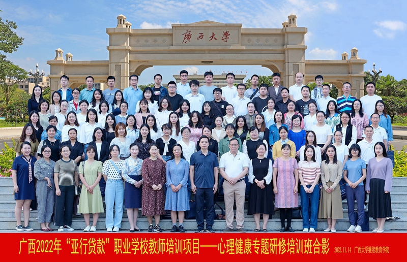为提高职业院校心理健康教育专兼职教师开展心理辅导、心理干预、心理调节、心理防控等能力和水平,11月13日至19日,由广西壮族自治区教师培训中心主办、我校继续教育学院承办的广西2022年“亚行贷款”职业学校教师培训项目—心理健康专题研修培训班在mk开户举办,来自全区高职院校、区直中职学校和地市中职学校的心理健康教育专兼职教师共98名参加培训。