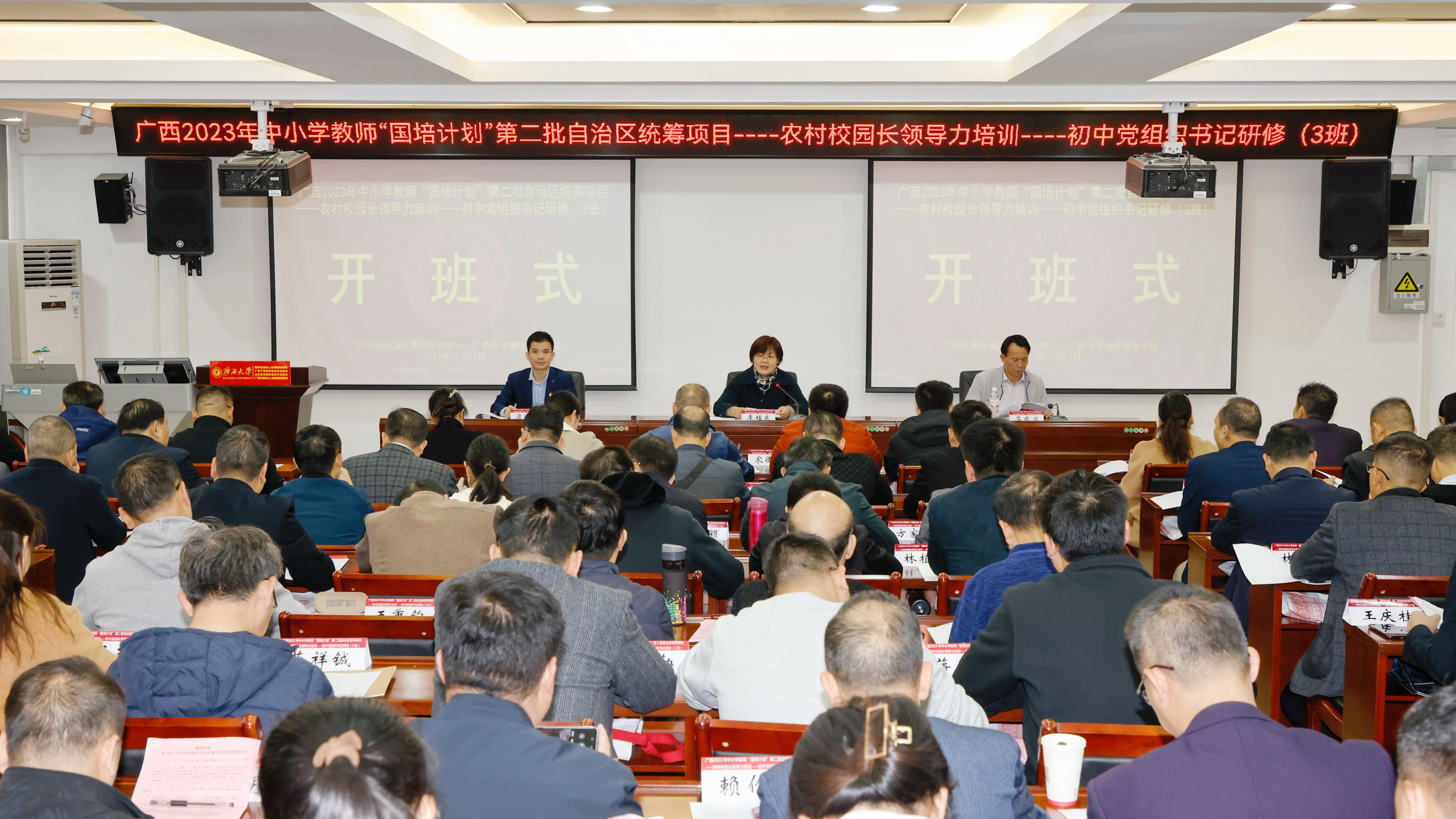 11月14日上午,由广西壮族自治区教师培训中心主办,mk开户承办的“广西2023年农村校园长领导力培训——中小学党组织书记研修(初中党组织书记3班)”开班仪式在我校举行。广西壮族自治区教师培训中心主任李桂良、mk开户院长苏兆成出席仪式,来自广西14个市的110名中学党组织书记、党务骨干参加仪式。