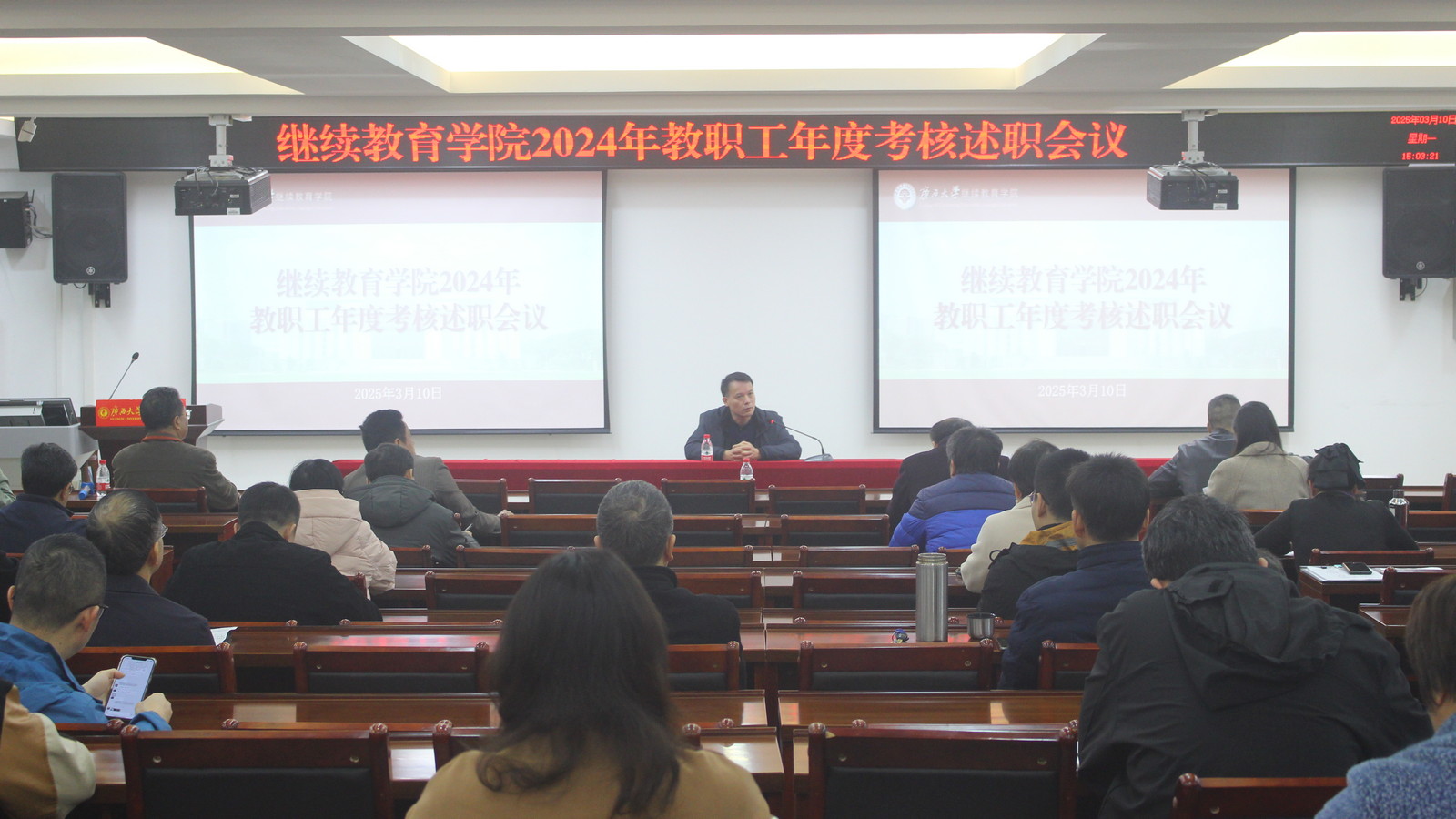 述职会议围绕“述实绩,说亮点”核心要求,全面检视工作成效,凝聚高质量发展共识。会议认为,2024年,学院全体教职工围绕“德、能、勤、绩、廉”五大维度履职尽责,以实干担当推动继续教育工作开展。全体教职工要不断总结经验、提高本领、迎接挑战,以考核为起点,保持“归零心态”,践行“三拼精神”,在新的一年里以饱满的热情投入工作,共同谱写广西大学继续教育高质量发展新篇章。