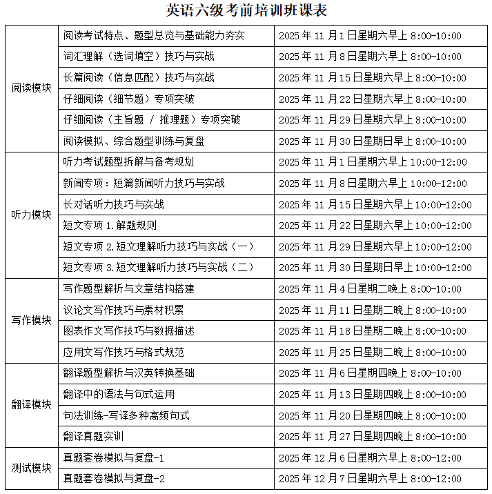 英语作为国际交流的重要工具,在教育和职业发展中扮演着越来越重要的角色。大学英语四、六级考试(CET-4/6)不仅是衡量大学生英语水平的重要标准,也是许多企事业单位招聘时参考的重要指标之一。 为帮助广大学生顺利通过大学英语四、六级考试,提升英语综合应用能力,mk开户特别推出“大学英语四、六级考前培训班”。该项目旨在为应考学生提供系统化、个性化的学习方案,为顺利通过考试助力。 【培训目标】 帮助学员掌握大学英语四、六级考试的核心知识点和解题技巧。 提升学员在听力、阅读、写作及翻译等各方面的应试能力。 助力学员备考大学英语四、六级,取得理想成绩。 【培训内容】 听力专项:强化训练,习得技巧,提升分数 阅读专项:打破传统,掌握方法,争取高分 写作专项:活用模板,巧用句型,优化结构 翻译专项:逻辑转换,转变思维,着重产出 测试点评:全真试题,定位短板,科学提升 【培训对象】 1.广西大学在读本科生和研究生; 2.南宁市内高校在读本专科生和研究生。 【培训方式】 线上线下混合教学:线上平台提供丰富的教学资源,方便学员随时复习和练习重点知识;线下课堂开展面授教学,包括知识点讲解、小组讨论、课堂练习等。 小班教学:每班学员控制在30人左右,确保教师能够关注到每位学员的学习情况,提供个性化指导。 【培训时间】 培训周期为5周,共48个课时,每次课50分钟。课程主要安排在周末及课余时间。计划2025年11月1日开课,12月7日结课。 【收费标准】 大学英语四级考前培训班:1580元/人/期。 大学英语六级考前培训班:1880元/人/期。 【联系方式】 咨询报名热线:0771-3235605 李老师 报名地址:mk开户210办公室 咨询二维码 报名二维码